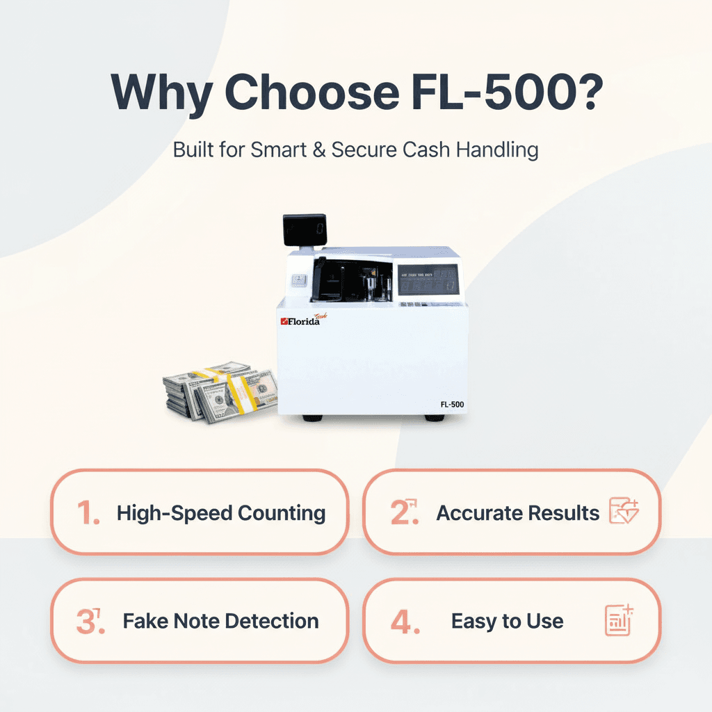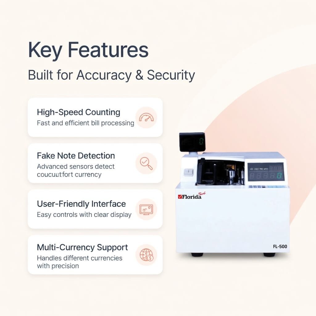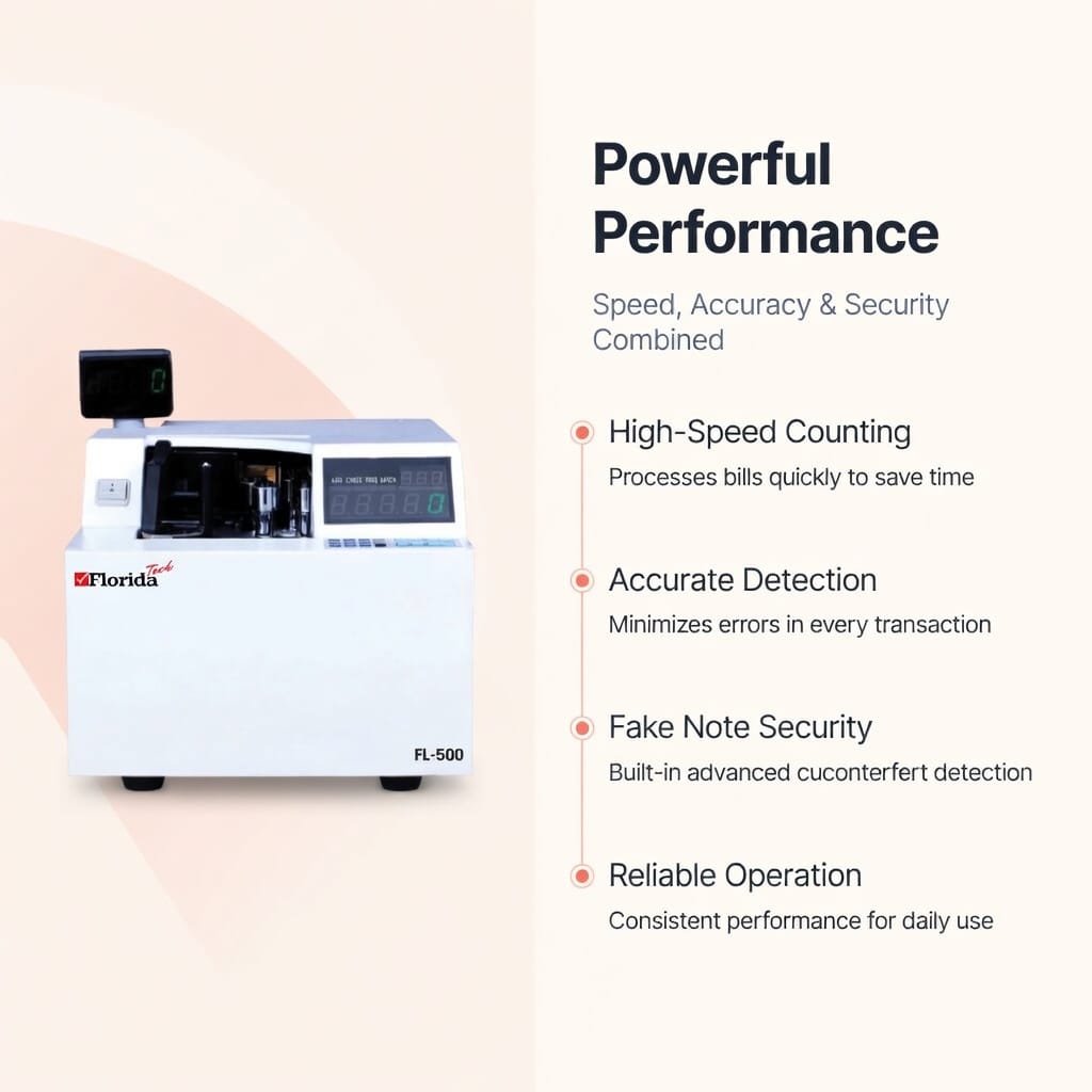 Desktop Type High-Speed Vacuum Currency Counter with Accuracy: The Key to Strapped Banknote Verification. The FL-500 is a fast and accurate desktop vacuum currency counter designed with a robust build and strong construction. Its high-performance vacuum system facilitates the counting of banknotes of various conditions, ranging from old to mint. Equipped with a large LED display for operators and a pole display for customers, the counting process is transparent for both parties. Standard features such as free count, batch function, and add function make it an ideal choice for high-volume counting needs.