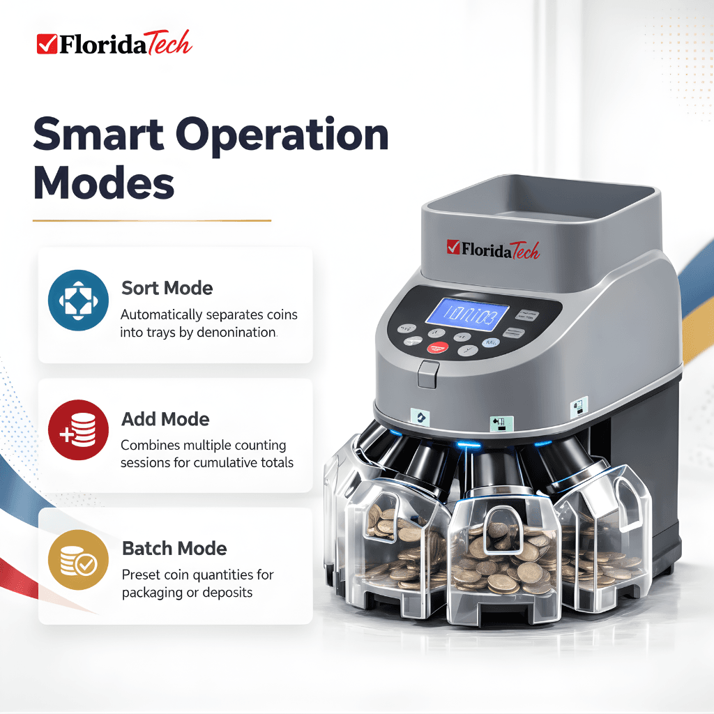 | Batch Mode | Allows preset coin quantities for packaging or bank deposits. |