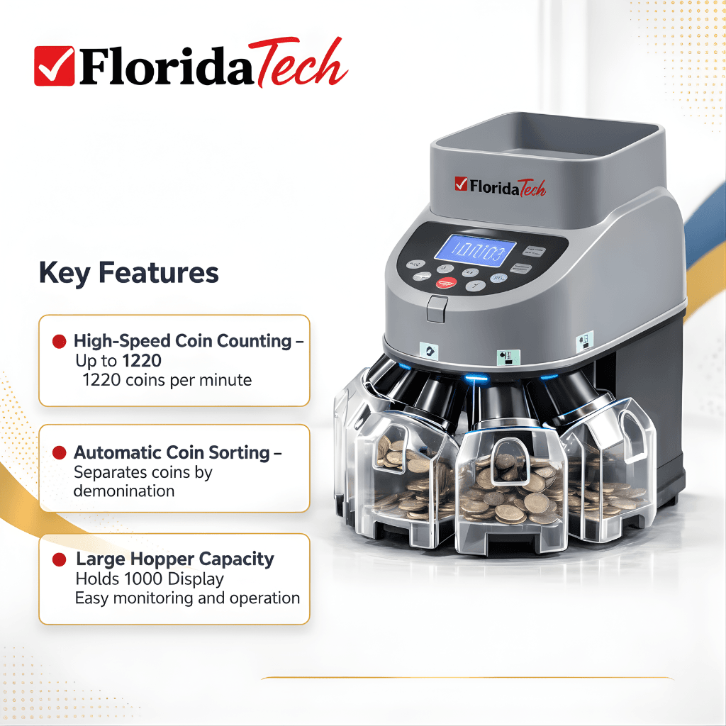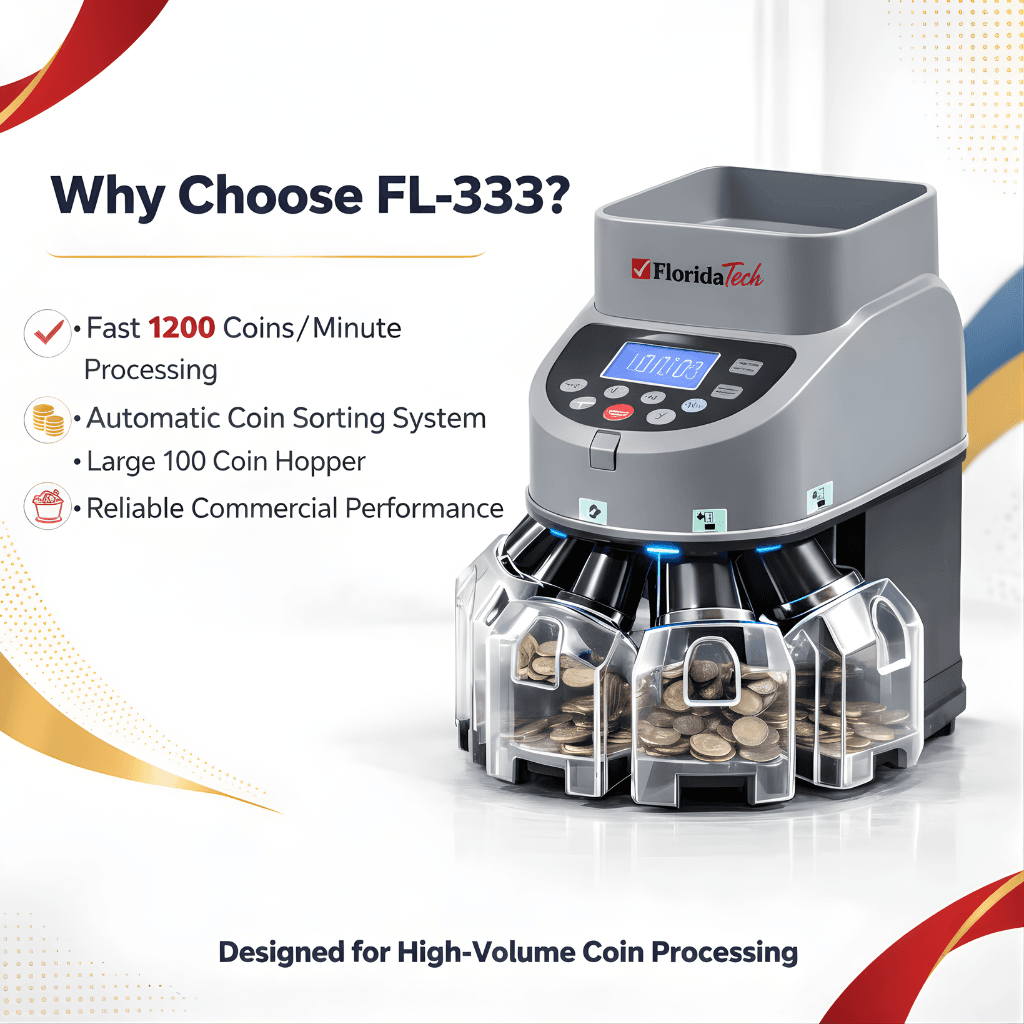 The Florida Tech FL-333 is a high-performance coin counting and sorting machine designed for businesses that process large volumes of coins daily. It automatically sorts coins by denomination while counting them quickly and accurately.